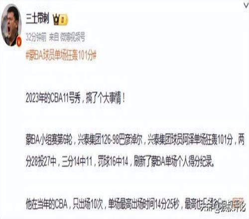 北京时间10月21日,BA小组赛第6轮,兴泰集团126-98巴彦淖尔,前CBA球员阿泽单场狂轰101分,两分28投27中,三分14中11,刷新了蒙BA单场个人得分纪录。