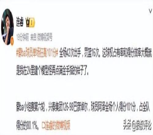 博主罗掌柜体育发文点评:超越张伯伦!蒙BA球员单场狂轰101分,两分28投27中,三分14中11。