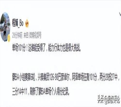 媒体人程博社媒发文点评阿泽单场101分:即使能力行体力也是很大挑战。
